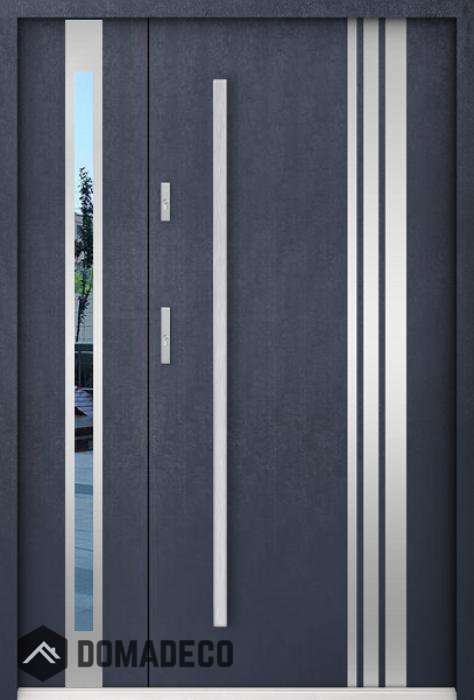 Die Türen bestehen aus Edelstahl. Im Inneren ist es mit PUR-Polyurethanschaum und Holz gefüllt. Die Türblattdicke beträgt 55 mm. Doppeldichtungssystem - Eine Dichtung befindet sich am unteren Rand des Rahmens und die andere im Lagerteil des Türblatts. Sie reduzieren Vibrationen und schützen Ihr Zuhause vor Wärmeverlust. Sie ändern ihre Lautstärke nicht unter dem Einfluss von Wetterbedingungen. Der Türrahmen hat einbruchhemmende Verstärkungen in den Scharnierteilen und Verriegelungspunkten.