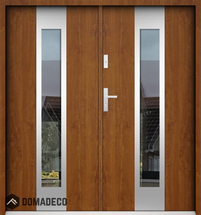 Die Türen bestehen aus Edelstahl. Im Inneren ist es mit PUR-Polyurethanschaum und Holz gefüllt. Die Türblattdicke beträgt 55 mm. Doppeldichtungssystem - Eine Dichtung befindet sich am unteren Rand des Rahmens und die andere im Lagerteil des Türblatts. Sie reduzieren Vibrationen und schützen Ihr Zuhause vor Wärmeverlust. Sie ändern ihre Lautstärke nicht unter dem Einfluss von Wetterbedingungen. Der Türrahmen hat einbruchhemmende Verstärkungen in den Scharnierteilen und Verriegelungspunkten.