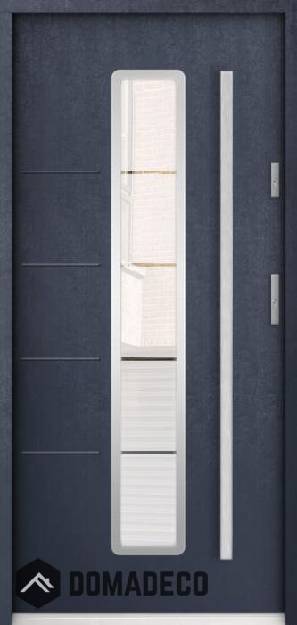 Die Türen bestehen aus Edelstahl. Im Inneren ist es mit PUR-Polyurethanschaum und Holz gefüllt. Die Türblattdicke beträgt 55 mm. Doppeldichtungssystem - Eine Dichtung befindet sich am unteren Rand des Rahmens und die andere im Lagerteil des Türblatts. Sie reduzieren Vibrationen und schützen Ihr Zuhause vor Wärmeverlust. Sie ändern ihre Lautstärke nicht unter dem Einfluss von Wetterbedingungen. Der Türrahmen hat einbruchhemmende Verstärkungen in den Scharnierteilen und Verriegelungspunkten.