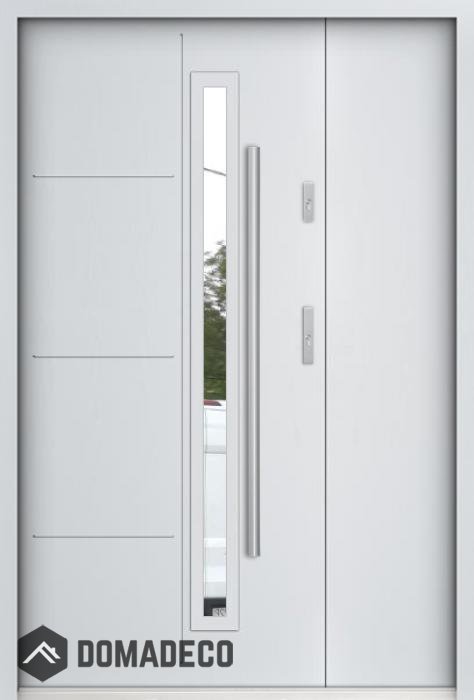Die Türen bestehen aus Edelstahl. Im Inneren ist es mit PUR-Polyurethanschaum und Holz gefüllt. Die Türblattdicke beträgt 55 mm. Doppeldichtungssystem - Eine Dichtung befindet sich am unteren Rand des Rahmens und die andere im Lagerteil des Türblatts. Sie reduzieren Vibrationen und schützen Ihr Zuhause vor Wärmeverlust. Sie ändern ihre Lautstärke nicht unter dem Einfluss von Wetterbedingungen. Der Türrahmen hat einbruchhemmende Verstärkungen in den Scharnierteilen und Verriegelungspunkten.