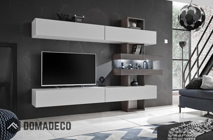 Tokyo ist eine TV-Wandeinheit, die das beste moderne Design bietet. Er passt perfekt in jedes Wohnzimmer! Sie verfügt über ein Schiebetür-Öffnungssystem ohne Griffe und hat einen offenen Raum für elektronische Komponenten. Vordertüren mit Soft-Opening-Mechanismus. Die Türen werden mit einem Push-Open-System geöffnet.