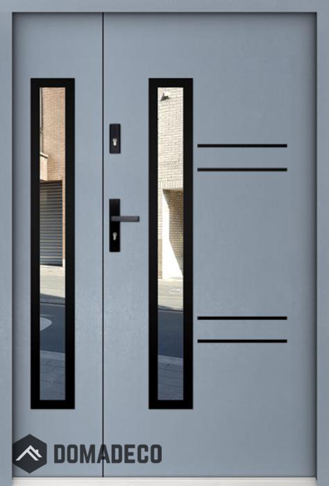 Die Türen bestehen aus Edelstahl. Im Inneren ist es mit PUR-Polyurethanschaum und Holz gefüllt. Die Türblattdicke beträgt 55 mm. Doppeldichtungssystem - Eine Dichtung befindet sich am unteren Rand des Rahmens und die andere im Lagerteil des Türblatts. Sie reduzieren Vibrationen und schützen Ihr Zuhause vor Wärmeverlust. Sie ändern ihre Lautstärke nicht unter dem Einfluss von Wetterbedingungen. Der Türrahmen hat einbruchhemmende Verstärkungen in den Scharnierteilen und Verriegelungspunkten.