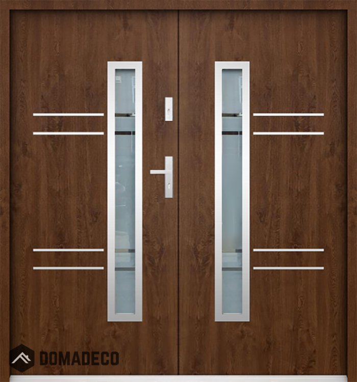 Die Türen bestehen aus Edelstahl. Im Inneren ist es mit PUR-Polyurethanschaum und Holz gefüllt. Die Türblattdicke beträgt 55 mm. Doppeldichtungssystem - Eine Dichtung befindet sich am unteren Rand des Rahmens und die andere im Lagerteil des Türblatts. Sie reduzieren Vibrationen und schützen Ihr Zuhause vor Wärmeverlust. Sie ändern ihre Lautstärke nicht unter dem Einfluss von Wetterbedingungen. Der Türrahmen hat einbruchhemmende Verstärkungen in den Scharnierteilen und Verriegelungspunkten.
