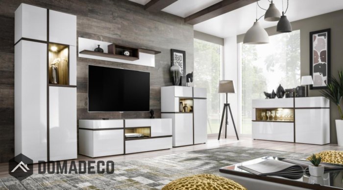 Hohe Vitrine: im Mittelteil offenes Loch mit weißer Led-Beleuchtung Quad. Oben 2 Türen, dahinter 1 Loch. Auf der rechten Seite sind Türen, dahinter 3 Regale. Auf der linken Seite sind Türen, dahinter 2 Einlegeböden. TV-Tisch : offenes Loch mit weißer LED-Beleuchtung Quad . Schublade mit Vollauszug. 2 Türen, dahinter jeweils ein Loch. Niedrige Vitrine: im mittleren Teil ist ein Loch mit weißen Led LIGHT.