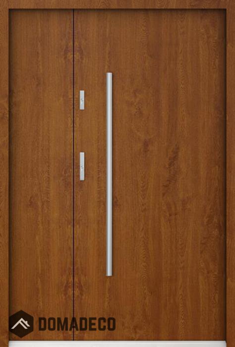 Die Türen bestehen aus Edelstahl. Im Inneren ist es mit PUR-Polyurethanschaum und Holz gefüllt. Die Türblattdicke beträgt 55 mm. Doppeldichtungssystem - Eine Dichtung befindet sich am unteren Rand des Rahmens und die andere im Lagerteil des Türblatts. Sie reduzieren Vibrationen und schützen Ihr Zuhause vor Wärmeverlust. Sie ändern ihre Lautstärke nicht unter dem Einfluss von Wetterbedingungen. Der Türrahmen hat einbruchhemmende Verstärkungen in den Scharnierteilen und Verriegelungspunkten.