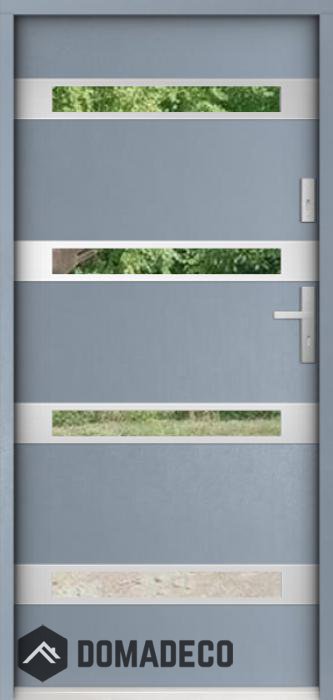 Die Türen bestehen aus Edelstahl. Im Inneren ist es mit PUR-Polyurethanschaum und Holz gefüllt. Die Türblattdicke beträgt 55 mm. Doppeldichtungssystem - Eine Dichtung befindet sich am unteren Rand des Rahmens und die andere im Lagerteil des Türblatts. Sie reduzieren Vibrationen und schützen Ihr Zuhause vor Wärmeverlust. Sie ändern ihre Lautstärke nicht unter dem Einfluss von Wetterbedingungen. Der Türrahmen hat einbruchhemmende Verstärkungen in den Scharnierteilen und Verriegelungspunkten.