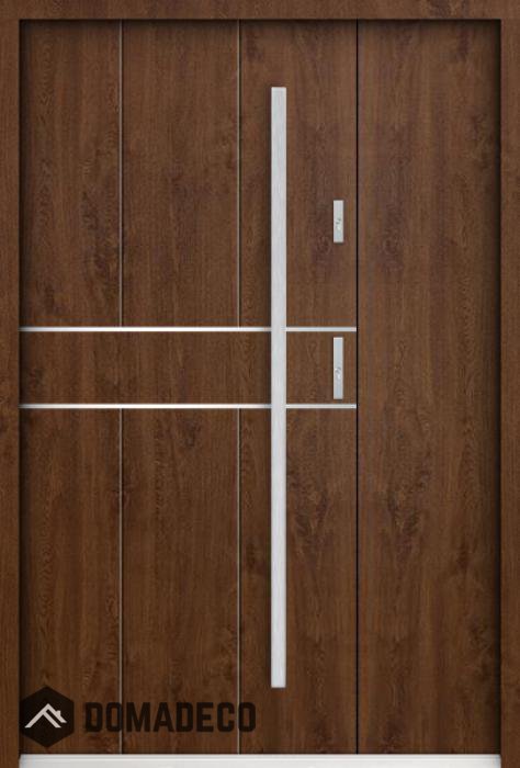 Die Türen bestehen aus Edelstahl. Im Inneren ist es mit PUR-Polyurethanschaum und Holz gefüllt. Die Türblattdicke beträgt 55 mm. Doppeldichtungssystem - Eine Dichtung befindet sich am unteren Rand des Rahmens und die andere im Lagerteil des Türblatts. Sie reduzieren Vibrationen und schützen Ihr Zuhause vor Wärmeverlust. Sie ändern ihre Lautstärke nicht unter dem Einfluss von Wetterbedingungen. Der Türrahmen hat einbruchhemmende Verstärkungen in den Scharnierteilen und Verriegelungspunkten.