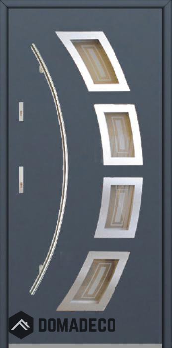 Die Türen bestehen aus Edelstahl. Im Inneren ist es mit PUR-Polyurethanschaum und Holz gefüllt. Die Türblattdicke beträgt 64 mm. Doppeldichtungssystem - Eine Dichtung befindet sich am unteren Rand des Rahmens und die andere im Lagerteil des Türblatts. Sie reduzieren Vibrationen und schützen Ihr Zuhause vor Wärmeverlust. Sie ändern ihre Lautstärke nicht unter dem Einfluss von Wetterbedingungen. Der Türrahmen hat einbruchhemmende Verstärkungen in den Scharnierteilen und Verriegelungspunkten.