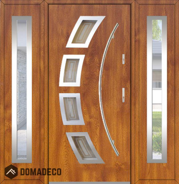 Die Türen bestehen aus Edelstahl. Im Inneren ist es mit PUR-Polyurethanschaum und Holz gefüllt. Die Türblattdicke beträgt 54 mm. Doppeldichtungssystem - Eine Dichtung befindet sich am unteren Rand des Rahmens und die andere im Lagerteil des Türblatts. Sie reduzieren Vibrationen und schützen Ihr Zuhause vor Wärmeverlust. Sie ändern ihre Lautstärke nicht unter dem Einfluss von Wetterbedingungen. Der Türrahmen hat einbruchhemmende Verstärkungen in den Scharnierteilen und Verriegelungspunkten.