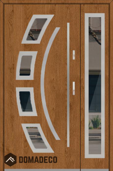 Die Türen bestehen aus Edelstahl. Im Inneren ist es mit PUR-Polyurethanschaum und Holz gefüllt. Die Türblattdicke beträgt 54 mm. Doppeldichtungssystem - Eine Dichtung befindet sich am unteren Rand des Rahmens und die andere im Lagerteil des Türblatts. Sie reduzieren Vibrationen und schützen Ihr Zuhause vor Wärmeverlust. Sie ändern ihre Lautstärke nicht unter dem Einfluss von Wetterbedingungen. Der Türrahmen hat einbruchhemmende Verstärkungen in den Scharnierteilen und Verriegelungspunkten.