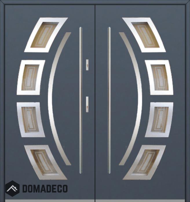 Die Türen bestehen aus Edelstahl. Im Inneren ist es mit PUR-Polyurethanschaum und Holz gefüllt. Die Türblattdicke beträgt 54 mm. Doppeldichtungssystem - Eine Dichtung befindet sich am unteren Rand des Rahmens und die andere im Lagerteil des Türblatts. Sie reduzieren Vibrationen und schützen Ihr Zuhause vor Wärmeverlust. Sie ändern ihre Lautstärke nicht unter dem Einfluss von Wetterbedingungen. Der Türrahmen hat einbruchhemmende Verstärkungen in den Scharnierteilen und Verriegelungspunkten.