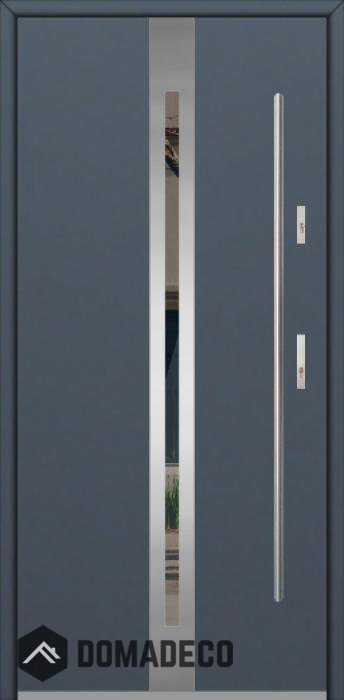 Die Türen bestehen aus Edelstahl. Im Inneren ist es mit PUR-Polyurethanschaum und Holz gefüllt. Die Türblattdicke beträgt 64 mm. Doppeldichtungssystem - Eine Dichtung befindet sich am unteren Rand des Rahmens und die andere im Lagerteil des Türblatts. Sie reduzieren Vibrationen und schützen Ihr Zuhause vor Wärmeverlust. Sie ändern ihre Lautstärke nicht unter dem Einfluss von Wetterbedingungen. Der Türrahmen hat einbruchhemmende Verstärkungen in den Scharnierteilen und Verriegelungspunkten.