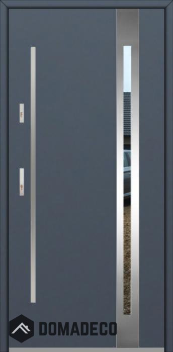 Die Türen bestehen aus Edelstahl. Im Inneren ist es mit PUR-Polyurethanschaum und Holz gefüllt. Die Türblattdicke beträgt 64 mm. Doppeldichtungssystem - Eine Dichtung befindet sich am unteren Rand des Rahmens und die andere im Lagerteil des Türblatts. Sie reduzieren Vibrationen und schützen Ihr Zuhause vor Wärmeverlust. Sie ändern ihre Lautstärke nicht unter dem Einfluss von Wetterbedingungen. Der Türrahmen hat einbruchhemmende Verstärkungen in den Scharnierteilen und Verriegelungspunkten.