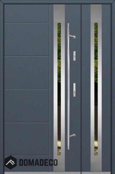 Die Türen bestehen aus Edelstahl. Im Inneren ist es mit PUR-Polyurethanschaum und Holz gefüllt. Die Türblattdicke beträgt 54 mm. Doppeldichtungssystem - Eine Dichtung befindet sich am unteren Rand des Rahmens und die andere im Lagerteil des Türblatts. Sie reduzieren Vibrationen und schützen Ihr Zuhause vor Wärmeverlust. Sie ändern ihre Lautstärke nicht unter dem Einfluss von Wetterbedingungen. Der Türrahmen hat einbruchhemmende Verstärkungen in den Scharnierteilen und Verriegelungspunkten.