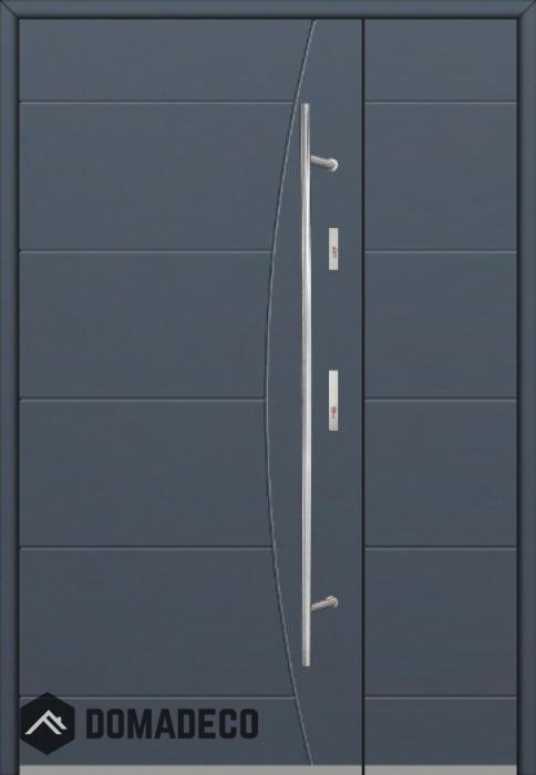 Die Türen bestehen aus Edelstahl. Im Inneren ist es mit PUR-Polyurethanschaum und Holz gefüllt. Die Türblattdicke beträgt 54 mm. Doppeldichtungssystem - Eine Dichtung befindet sich am unteren Rand des Rahmens und die andere im Lagerteil des Türblatts. Sie reduzieren Vibrationen und schützen Ihr Zuhause vor Wärmeverlust. Sie ändern ihre Lautstärke nicht unter dem Einfluss von Wetterbedingungen. Der Türrahmen hat einbruchhemmende Verstärkungen in den Scharnierteilen und Verriegelungspunkten.