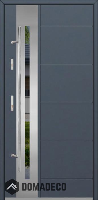 Die Türen bestehen aus Edelstahl. Im Inneren ist es mit PUR-Polyurethanschaum und Holz gefüllt. Die Türblattdicke beträgt 64 mm. Doppeldichtungssystem - Eine Dichtung befindet sich am unteren Rand des Rahmens und die andere im Lagerteil des Türblatts. Sie reduzieren Vibrationen und schützen Ihr Zuhause vor Wärmeverlust. Sie ändern ihre Lautstärke nicht unter dem Einfluss von Wetterbedingungen. Der Türrahmen hat einbruchhemmende Verstärkungen in den Scharnierteilen und Verriegelungspunkten.