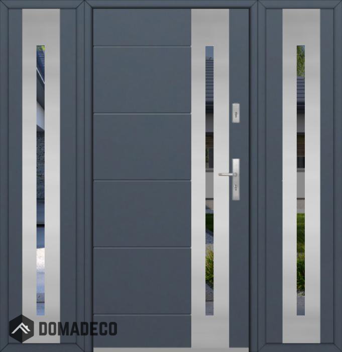Die Türen bestehen aus Edelstahl. Im Inneren ist es mit PUR-Polyurethanschaum und Holz gefüllt. Die Türblattdicke beträgt 54 mm. Doppeldichtungssystem - Eine Dichtung befindet sich am unteren Rand des Rahmens und die andere im Lagerteil des Türblatts. Sie reduzieren Vibrationen und schützen Ihr Zuhause vor Wärmeverlust. Sie ändern ihre Lautstärke nicht unter dem Einfluss von Wetterbedingungen. Der Türrahmen hat einbruchhemmende Verstärkungen in den Scharnierteilen und Verriegelungspunkten.