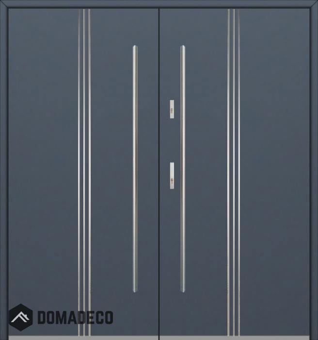 Die Türen bestehen aus Edelstahl. Im Inneren ist es mit PUR-Polyurethanschaum und Holz gefüllt. Die Türblattdicke beträgt 54 mm. Doppeldichtungssystem - Eine Dichtung befindet sich am unteren Rand des Rahmens und die andere im Lagerteil des Türblatts. Sie reduzieren Vibrationen und schützen Ihr Zuhause vor Wärmeverlust. Sie ändern ihre Lautstärke nicht unter dem Einfluss von Wetterbedingungen. Der Türrahmen hat einbruchhemmende Verstärkungen in den Scharnierteilen und Verriegelungspunkten.