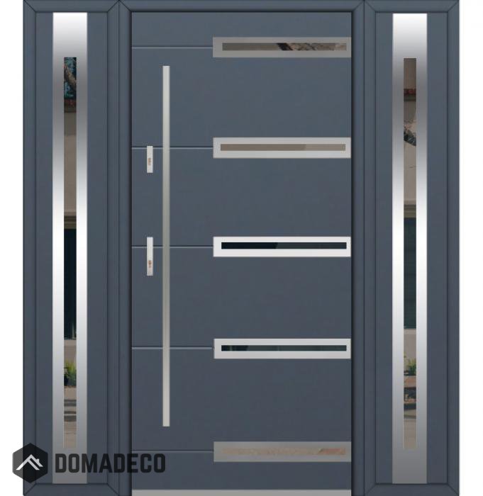 Die Türen bestehen aus Edelstahl. Im Inneren ist es mit PUR-Polyurethanschaum und Holz gefüllt. Die Türblattdicke beträgt 54 mm. Doppeldichtungssystem - Eine Dichtung befindet sich am unteren Rand des Rahmens und die andere im Lagerteil des Türblatts. Sie reduzieren Vibrationen und schützen Ihr Zuhause vor Wärmeverlust. Sie ändern ihre Lautstärke nicht unter dem Einfluss von Wetterbedingungen. Der Türrahmen hat einbruchhemmende Verstärkungen in den Scharnierteilen und Verriegelungspunkten.