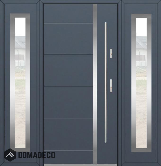 Die Türen bestehen aus Edelstahl. Im Inneren ist es mit PUR-Polyurethanschaum und Holz gefüllt. Die Türblattdicke beträgt 54 mm. Doppeldichtungssystem - Eine Dichtung befindet sich am unteren Rand des Rahmens und die andere im Lagerteil des Türblatts. Sie reduzieren Vibrationen und schützen Ihr Zuhause vor Wärmeverlust. Sie ändern ihre Lautstärke nicht unter dem Einfluss von Wetterbedingungen. Der Türrahmen hat einbruchhemmende Verstärkungen in den Scharnierteilen und Verriegelungspunkten.