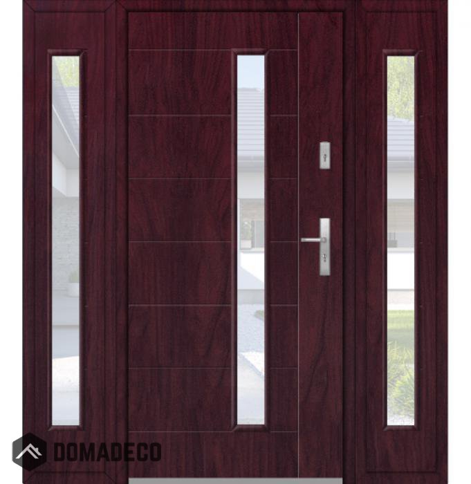 Die Türen bestehen aus Edelstahl. Im Inneren ist es mit PUR-Polyurethanschaum und Holz gefüllt. Die Türblattdicke beträgt 54 mm. Doppeldichtungssystem - Eine Dichtung befindet sich am unteren Rand des Rahmens und die andere im Lagerteil des Türblatts. Sie reduzieren Vibrationen und schützen Ihr Zuhause vor Wärmeverlust. Sie ändern ihre Lautstärke nicht unter dem Einfluss von Wetterbedingungen. Der Türrahmen hat einbruchhemmende Verstärkungen in den Scharnierteilen und Verriegelungspunkten.