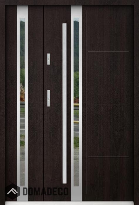 Die Türen bestehen aus Edelstahl. Im Inneren ist es mit PUR-Polyurethanschaum und Holz gefüllt. Die Türblattdicke beträgt 55 mm. Doppeldichtungssystem - Eine Dichtung befindet sich am unteren Rand des Rahmens und die andere im Lagerteil des Türblatts. Sie reduzieren Vibrationen und schützen Ihr Zuhause vor Wärmeverlust. Sie ändern ihre Lautstärke nicht unter dem Einfluss von Wetterbedingungen. Der Türrahmen hat einbruchhemmende Verstärkungen in den Scharnierteilen und Verriegelungspunkten.