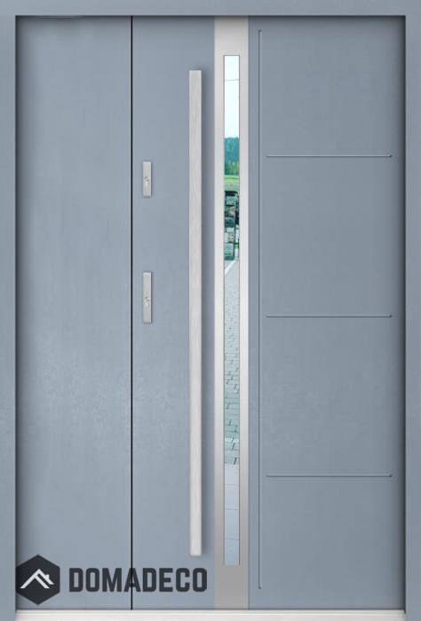 Die Türen bestehen aus Edelstahl. Im Inneren ist es mit PUR-Polyurethanschaum und Holz gefüllt. Die Türblattdicke beträgt 55 mm. Doppeldichtungssystem - Eine Dichtung befindet sich am unteren Rand des Rahmens und die andere im Lagerteil des Türblatts. Sie reduzieren Vibrationen und schützen Ihr Zuhause vor Wärmeverlust. Sie ändern ihre Lautstärke nicht unter dem Einfluss von Wetterbedingungen. Der Türrahmen hat einbruchhemmende Verstärkungen in den Scharnierteilen und Verriegelungspunkten.
