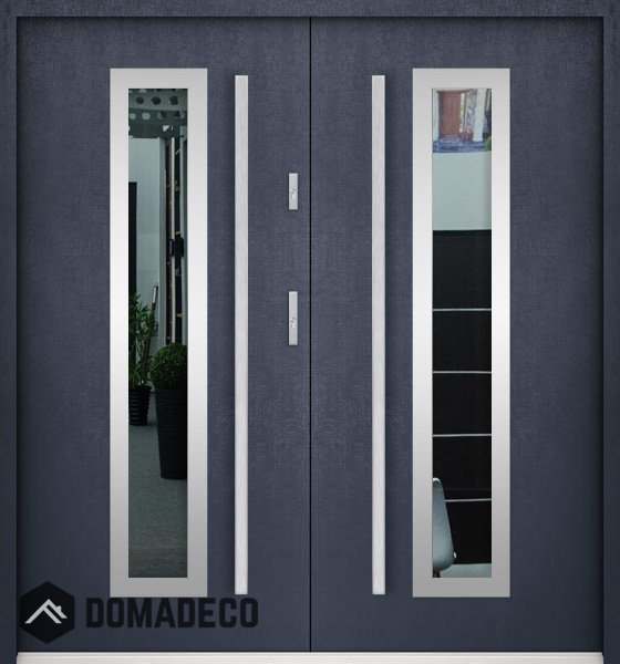Die Türen bestehen aus Edelstahl. Im Inneren ist es mit PUR-Polyurethanschaum und Holz gefüllt. Die Türblattdicke beträgt 55 mm. Doppeldichtungssystem - Eine Dichtung befindet sich am unteren Rand des Rahmens und die andere im Lagerteil des Türblatts. Sie reduzieren Vibrationen und schützen Ihr Zuhause vor Wärmeverlust. Sie ändern ihre Lautstärke nicht unter dem Einfluss von Wetterbedingungen. Der Türrahmen hat einbruchhemmende Verstärkungen in den Scharnierteilen und Verriegelungspunkten.
