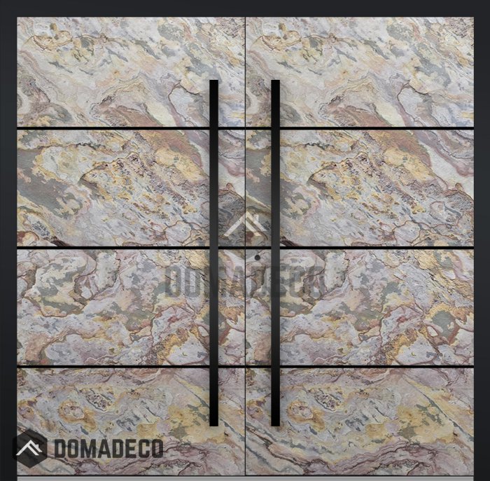 Die Türfüllungen bestehen aus gesintertem Quarz. Obwohl Quarzsinter in der Natur nicht vorkommt, besteht die Technologie zu seiner Gewinnung im Mischen und Pressen von u. a. Schieferton, Quarzsand und Granitgestein. Die auf diese Weise hergestellte Mischung wird durch Brennen gehärtet. Türfüllungen aus gesintertem Quarz haben einen industriellen, urbanen Stil und verweisen gleichzeitig auf exklusive und elegante Innenräume.