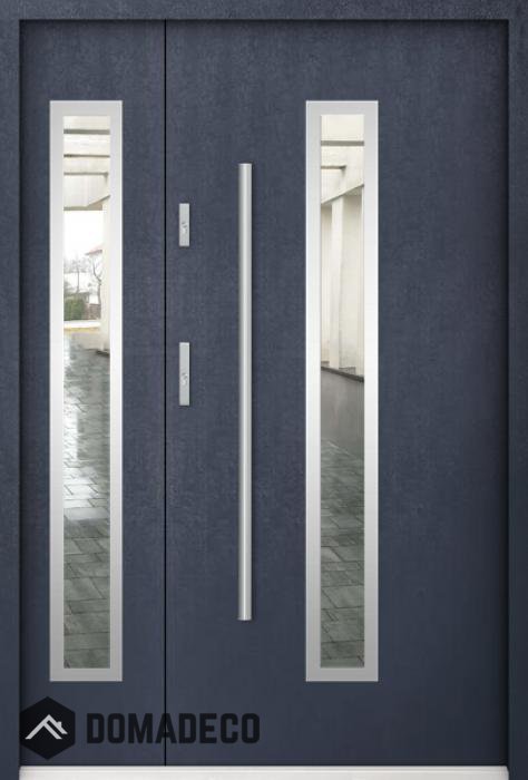 Die Türen bestehen aus Edelstahl. Im Inneren ist es mit PUR-Polyurethanschaum und Holz gefüllt. Die Türblattdicke beträgt 55 mm. Doppeldichtungssystem - Eine Dichtung befindet sich am unteren Rand des Rahmens und die andere im Lagerteil des Türblatts. Sie reduzieren Vibrationen und schützen Ihr Zuhause vor Wärmeverlust. Sie ändern ihre Lautstärke nicht unter dem Einfluss von Wetterbedingungen. Der Türrahmen hat einbruchhemmende Verstärkungen in den Scharnierteilen und Verriegelungspunkten.