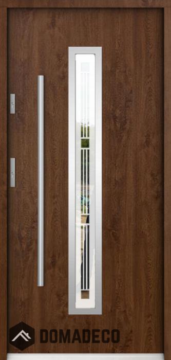 Die Türen bestehen aus Edelstahl. Im Inneren ist es mit PUR-Polyurethanschaum und Holz gefüllt. Die Türblattdicke beträgt 55 mm. Doppeldichtungssystem - Eine Dichtung befindet sich am unteren Rand des Rahmens und die andere im Lagerteil des Türblatts. Sie reduzieren Vibrationen und schützen Ihr Zuhause vor Wärmeverlust. Sie ändern ihre Lautstärke nicht unter dem Einfluss von Wetterbedingungen. Der Türrahmen hat einbruchhemmende Verstärkungen in den Scharnierteilen und Verriegelungspunkten.