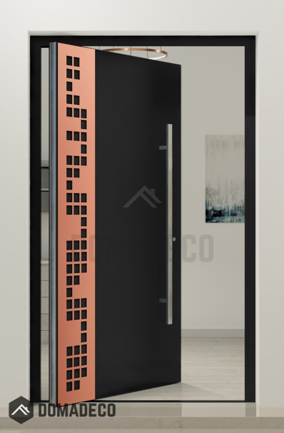 PIVOT C27 – Aluminium-Drehtür mit Kupferblechverkleidung und ausgeschnittenen Quadraten