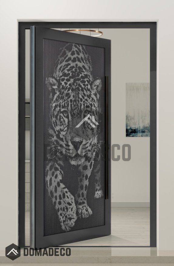 PIVOT G5 – Glas-Aluminium-Drehtür mit Tiger-Motiv in der Zierblende