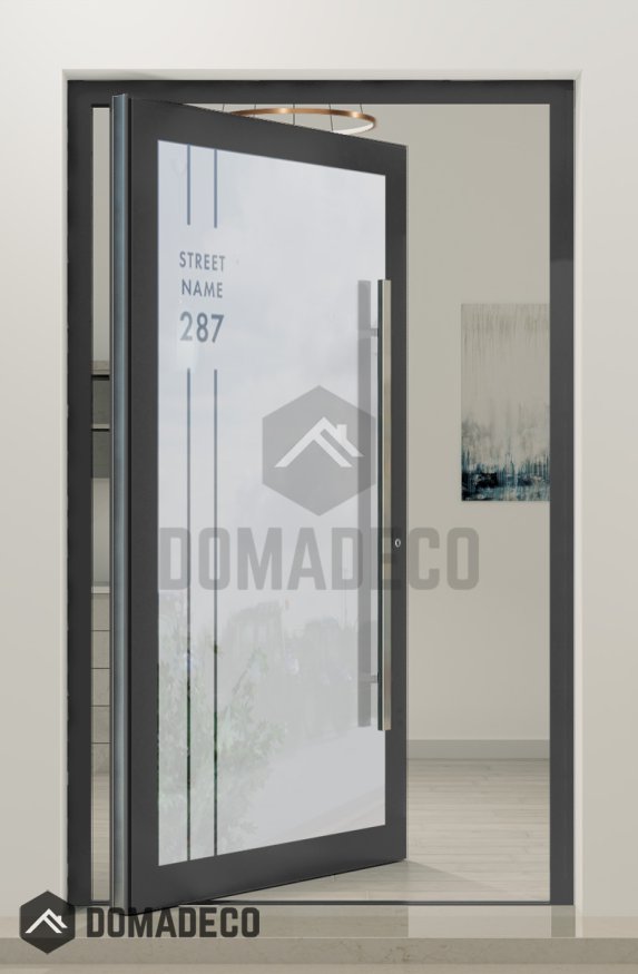 PIVOT Glass S23 – Aluminium-Drehtür mit mattierter Oberfläche und transparenter Hausnummer