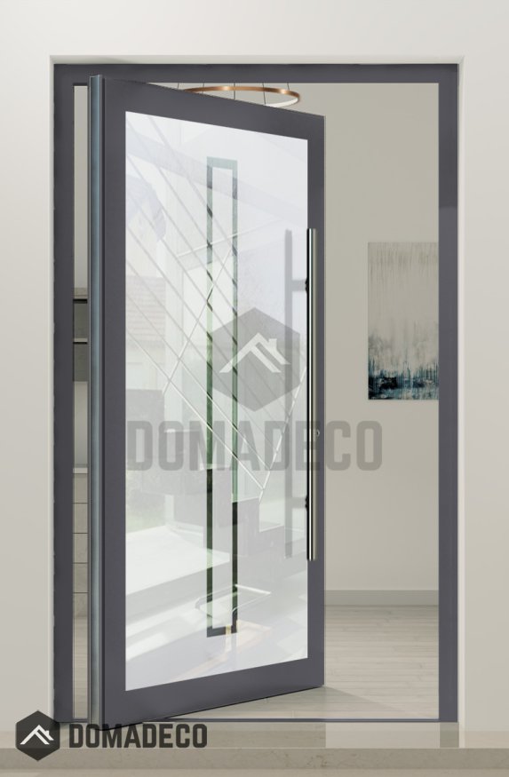 Die mit Präzision und Liebe zum Detail gefertigte Tür PIVOT Glass S2 besticht durch ihre schlichte und moderne Ästhetik, die sich sehen lassen kann. Der einzigartige Drehmechanismus ermöglicht ein müheloses und sanftes Öffnen der Tür und verleiht dem Eingang Ihres Hauses einen Hauch von Luxus. Die beiden transparenten Streifen, die sich durch die Milchglasscheiben ziehen, sind ein subtiles und doch auffälliges Designelement, das diese Tür von herkömmlichen Eingangstüren abhebt.