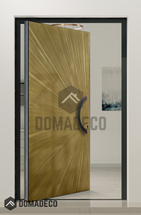 PIVOT M8 – Aluminium-Drehtür mit goldfarbener Struktur aus gefrästem Metall