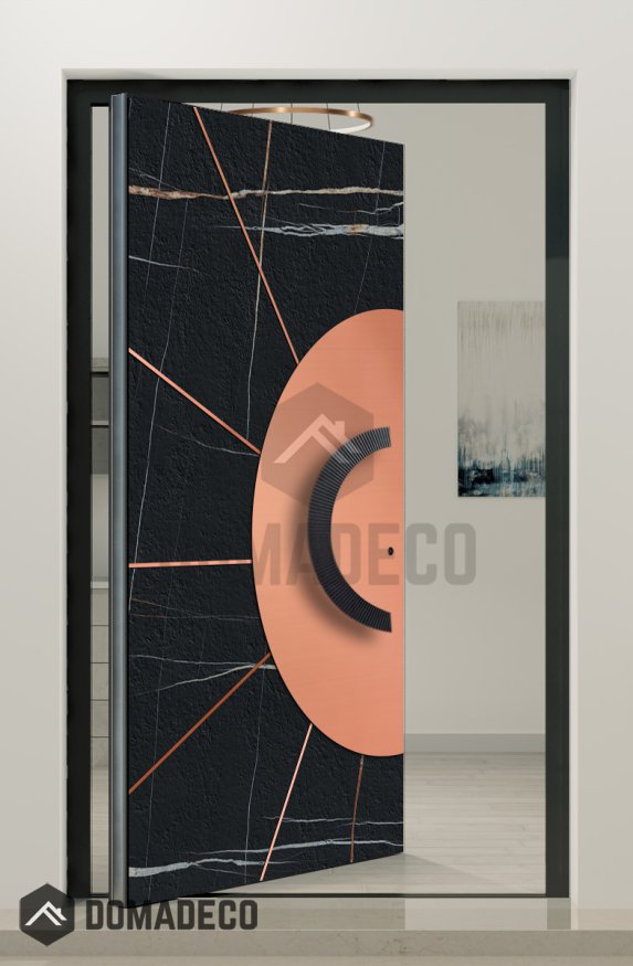 PIVOT Sahara – Aluminium-Drehtür mit Beschichtung aus Sahara Noir-Sinterquarz und Kupferblech