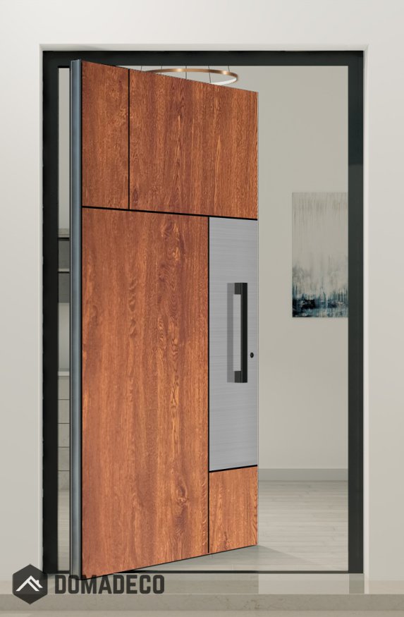 PIVOT V35 – Eingangstür aus Aluminium mit Holzstruktur und Edelstahl-Dekor