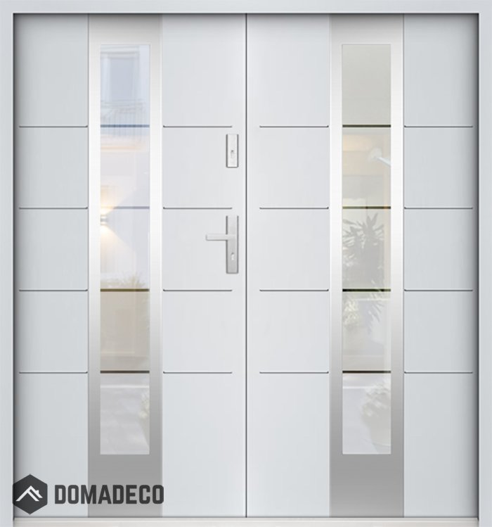 Die Türen bestehen aus Edelstahl. Im Inneren ist es mit PUR-Polyurethanschaum und Holz gefüllt. Die Türblattdicke beträgt 55 mm. Doppeldichtungssystem - Eine Dichtung befindet sich am unteren Rand des Rahmens und die andere im Lagerteil des Türblatts. Sie reduzieren Vibrationen und schützen Ihr Zuhause vor Wärmeverlust. Sie ändern ihre Lautstärke nicht unter dem Einfluss von Wetterbedingungen. Der Türrahmen hat einbruchhemmende Verstärkungen in den Scharnierteilen und Verriegelungspunkten.